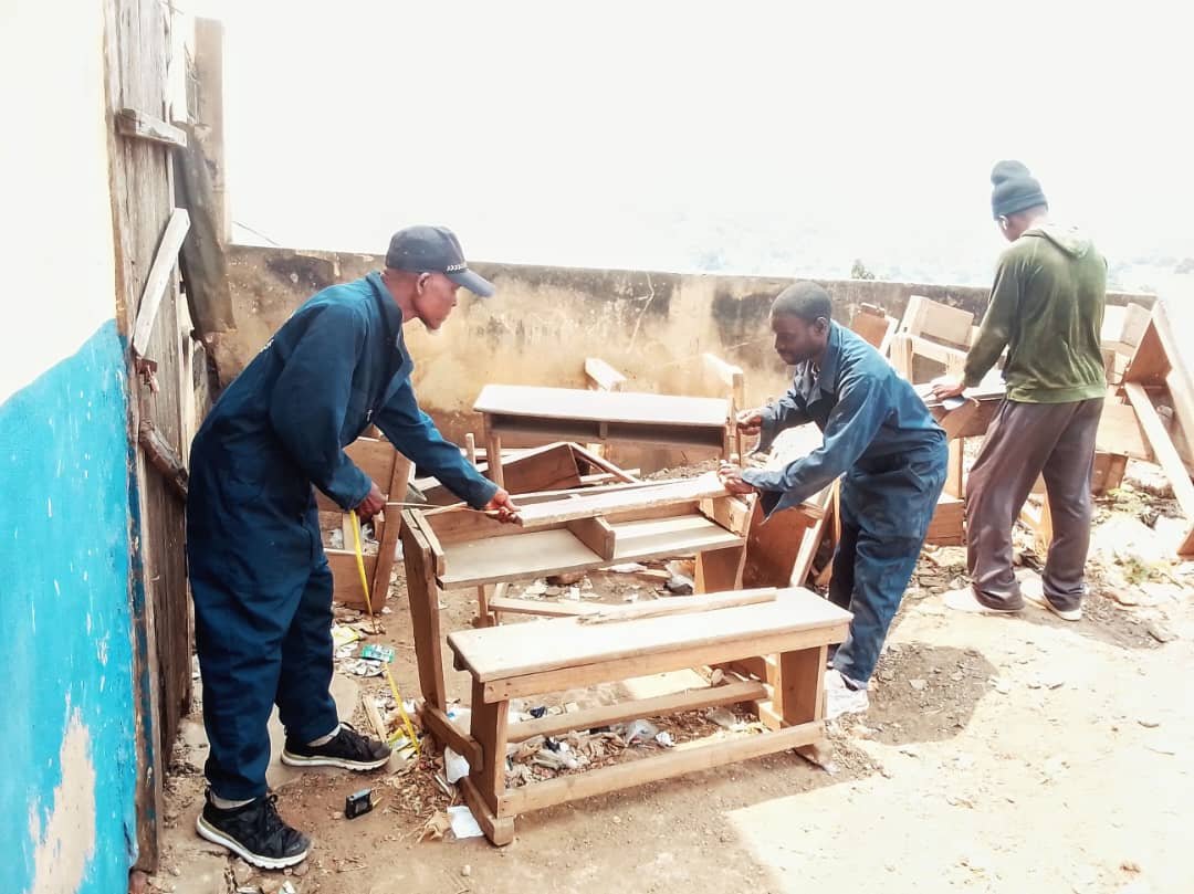Dans la perspective de Durabilité, un atelier de menuserie a été installé local à kananga coule pour la fabrication des bancs destinés aux autonmisation autonmisation Les Voulons que Chaques ÉLève de la rdc apprenne dans la dignité. Cela commence par un banc pour chaque enfant ».