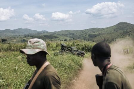 Des militaires congolais près de Kibirizi, dans la province du Nord-Kivu, le 14 mai 2024. ALEXIS HUGUET / AFP Les…