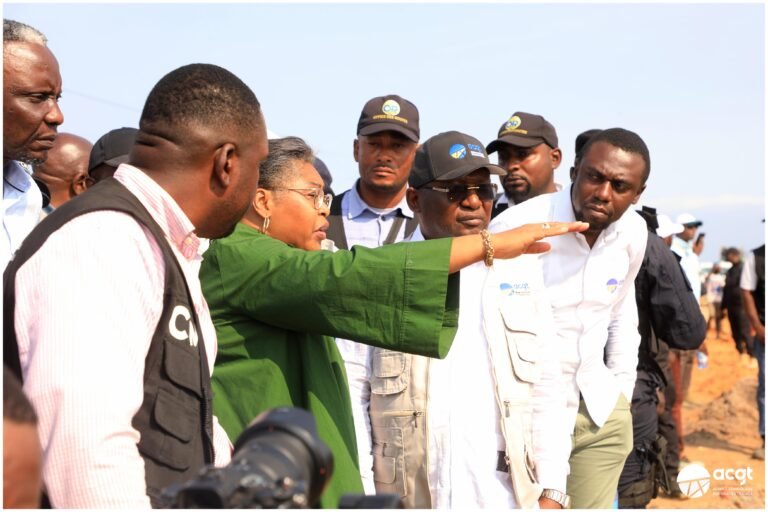 Sur la route du Littoral de Banana, La Cheffe du Gouvernement et sa désagation at reçu des détails sur la lutte mené par l’acgt contre l’Érosion Côtiere, Grâce aux fins de la société de geste de péage au congo.