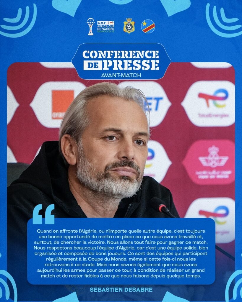 A quelques heures du match Algérie-RDC, notamment pour les huitièmes de finale de la Coupe d’Afrique des Nations, le sélectionneur national de la RDC croit en la victoire de ses joueurs. Lors de la conférence d’avant-match, tenue lundi 5 janvier à Rabat, Sébastien Désarbre a clarifié l’état d’esprit qui règne au sein du groupe congolais en déclaré : « Nous sommes concentrés uniquement sur la qualification », écartant toute distraction liée au prestige de l’adversaire ou à l’environnement médiatique. L’affiche Algérie-RDC s’annonce indécise, avec une issue incertaine pour les deux formations. Si les Congolais n’ont jamais battu leurs adversaires du…