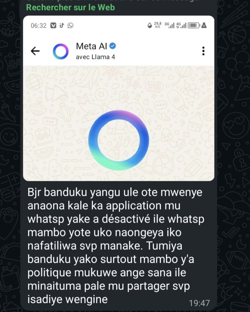 Chers internautes, notre attention porte sur la Meta AI Floating Bubble, cette bulle interactive déployée par l’entreprise Meta, et qui est accusée à tort d’espionner les personnes qui parlent politique dans les zones contrôlées par les rebelles du M23 , avec un risque présumé d’arrestation. Une affirmation qui relève clairement de la désinformation.Comme vous l’avez sans doute constaté, un message circule depuis quelques jours dans plusieurs groupes WhatsApp, affirmant que cette bulle flottante serait un logiciel espion. L’expéditeur de ce message anonyme, des milliers de fois partagés, invite même les utilisateurs à désinstaller WhatsApp, prétendant que toute discussion politique serait…