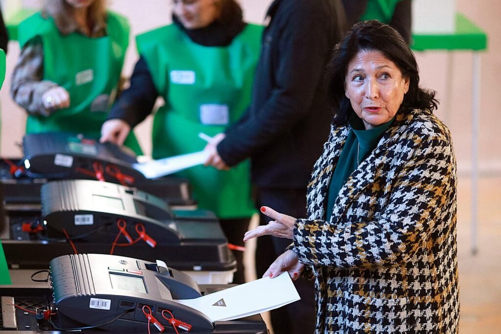 La présidente géorgienne, Salomé Zourabichvili, ici en train de voter le samedi 26 octobre 2024 à Tbilissi, a décrété dimanche une « falsification totale » des élections législatives. CHAKH AIVAZOV / AP La présidente géorgienne, Salomé Zourabichvili, figure pro-occidentale en rupture avec le gouvernement, a déclaré dimanche 27 octobre une « falsification totale » des élections législatives de la veille, qui ont été remportées par le parti prorusse au pouvoir mais sont contestées par l’ opposition. « Nous sommes témoins et victimes d’une opération russe spéciale, une forme moderne de guerre hybride contre le peuple géorgien », at-elle déclaré, sans…
