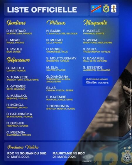 Le Sélectionneur de la RDC, Sébastien desabre a publié marse 4 Mars la lisete des 25 Léopards Convocoves pour affronter…